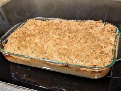 Sprinkle topping over apples, coating evenly, then bake for 20-25 minutes. Near the end of baking, if topping is not yet browning, set oven to broil for a few minutes.