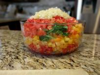 Dice tomatoes and add to a large bowl. Add vinegars, and shallot and garlic mixture.