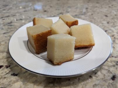 Pour into greased pan and bake for 60-70 minutes or until mochi jiggles only slightly when lightly jostled.