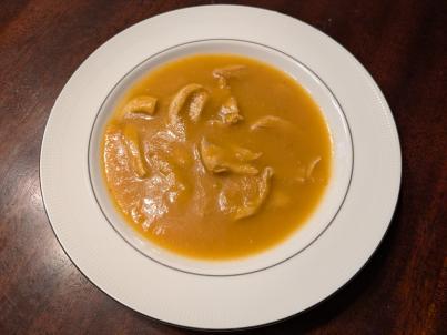 Add chicken pieces to blended vegetable broth and bring to a boil, then allow to simmer for another 10 minutes or so to allow all flavors to combine.