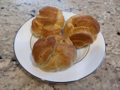 Spread a small amount of butter on a rolling pin and a smooth work surface, then roll out each piece of dough to about 8" in diameter and spread about 2 tsp of butter (a "pat" of butter) on it. Carefully roll into a log, then coil the log into a ball.