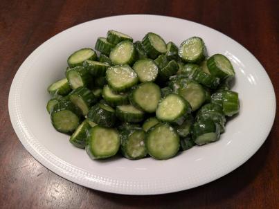 Slice cucmbers into 1.5 cm pieces, then sprinkle with salt and sugar, and toss to thoroughly coat. Let sit for half an hour, toss again, then let sit for another half hour.