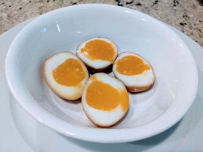 Combine water, soy sauce, mirin, and molasses, then peel eggs, rinse, and submerge in marinade. For best results, use a plate or some other object to keep eggs fully submerged.