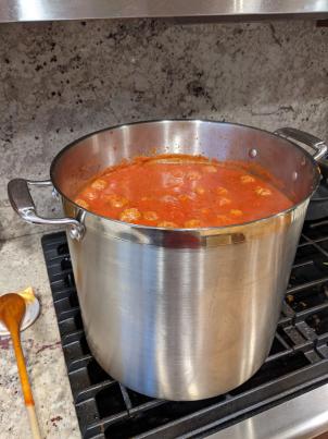 When sauce is heated to steaming, reduce heat to low and continue simmering for several hours, stirring occasionally to raise meatballs from bottom of pot; liquids will collect above and must be recombined.