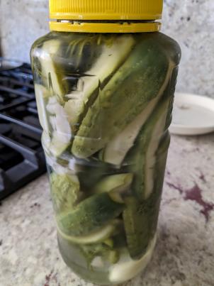Marinate at least 12-24 hours, tossing occasionally to give all cucumber pieces time submerged in the liquid.
