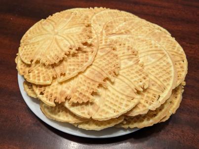 Dollop about 1 Tbsp per pizzelle in the pizzelle iron and cook until golden brown and crisp, about 1 minute. Some irons may need non-stick spray or oil brushed to avoid sticking.