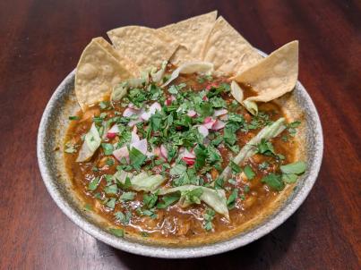 Serve with tortilla chips, chopped lettuce, sliced radish, lime juice, and avocado.