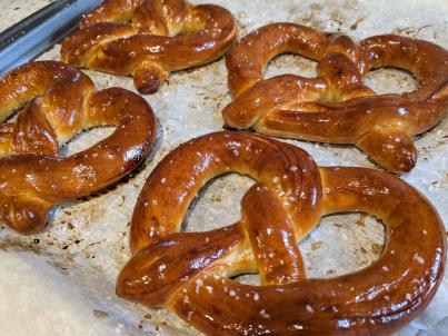 Roll each piece into a rope about 1 cm in diameter, as evenly as possible. Twist into pretzels, and dip each pretzel into the baking soda solution before placing on baking sheets.
