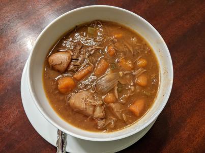 Chop carrots, celery or bok choy, and potatoes similarly, and add to the slow cooker.