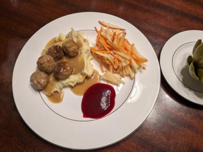 Combine all meatball ingredients other than meats, and mix thoroughly. Add meats and mix until well incorporated.