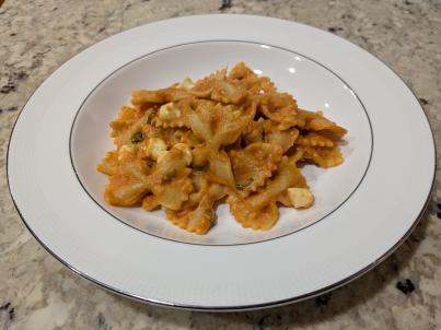 In a medium size pot, sauté garlic in olive oil until softened, then add crushed tomato, vodka, and corn starch mixed with water. Simmer, uncovered, about 10 minutes.