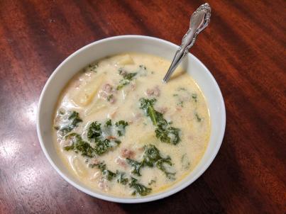 When potatoes are beginning to soften, add sausage, cream, milk, and kale pieces.